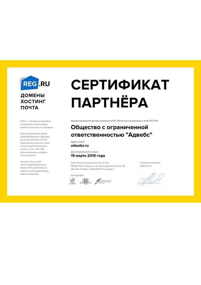 Сертификат партнера REG.ru