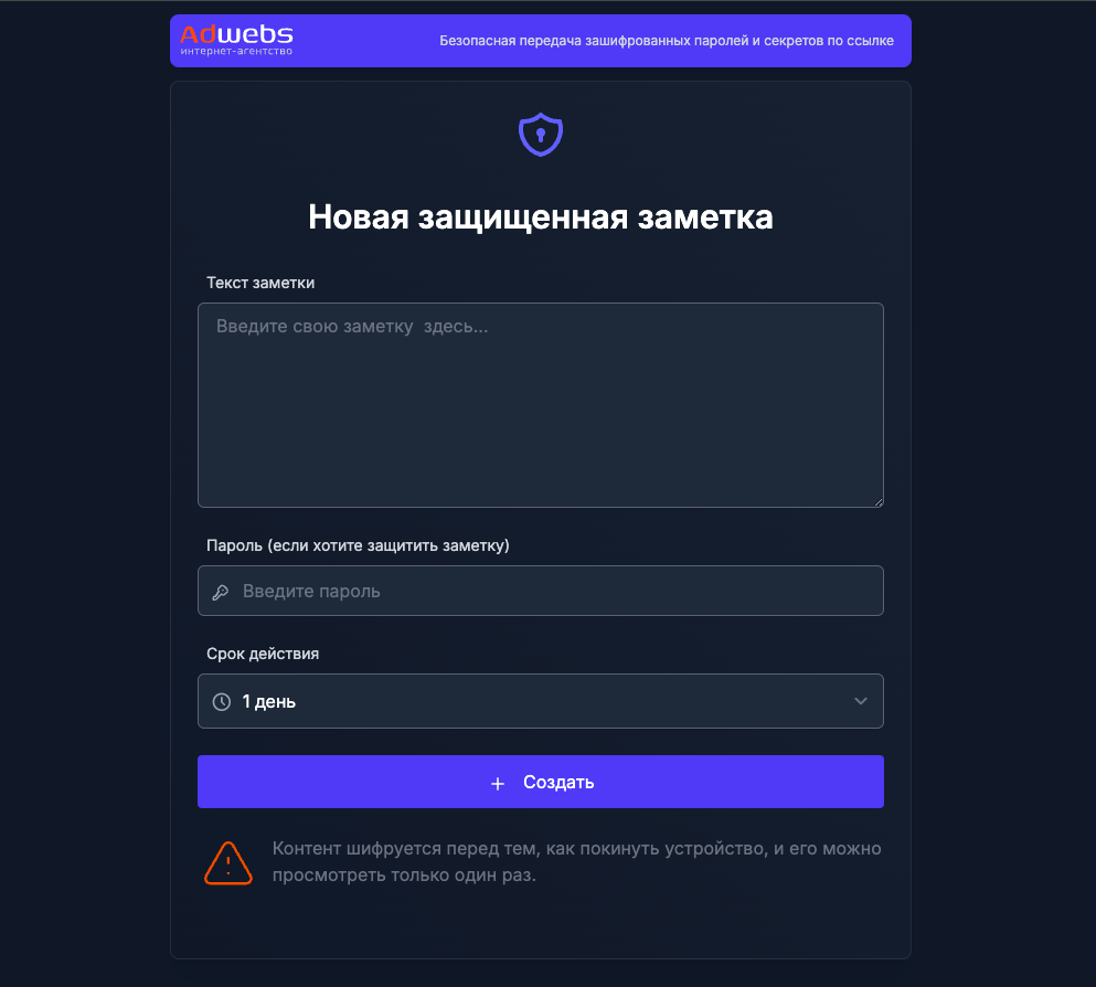 Создание новой защищенной заметки в веб-приложении Passwd Sender
