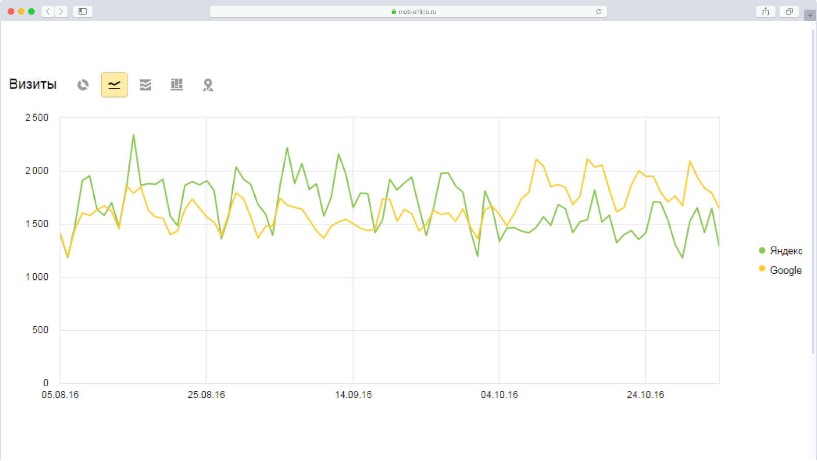 Продвижение интернет-магазина с нуля в конкурентной мебельной тематике. Изначальная цель - 500 посетителей в сутки была достигнута за 5 месяцев, впоследствии мы достигли 4 200 посетителей в сутки.