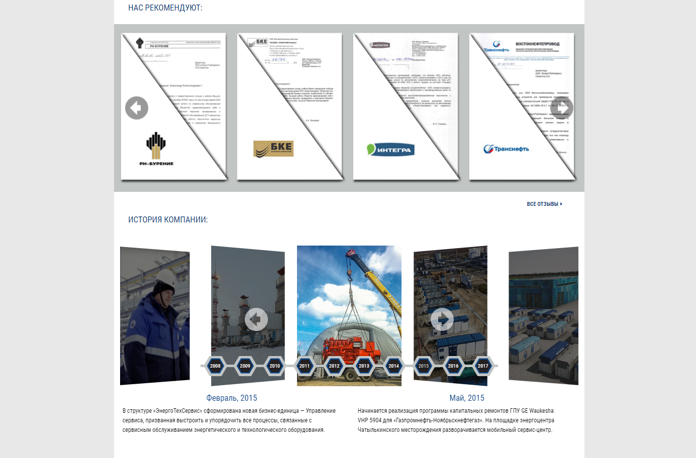Корпоративный сайт - мощный инструмент презентации компании для заказчиков и партнеров, поэтому основное место здесь отводится истории компании и ее опыту. Мы реализовали эффектный таймлайн, позволяющий наглядно показать основные вехи развития компании. В разделе референц-лист можно разместить значимые проекты компании, с подробными характеристиками и привязкой к карте. Раздел с отзывами заказчиков лаконичный и содержательный, есть возможность загружать оригиналы благодарственных писем и логотипов, кроме того, отзыв дублируется текстом. Главная страница сайта выполнена в виде ёмкой презентации, которая позволяет посетителю быстро получить основную информацию о компании.